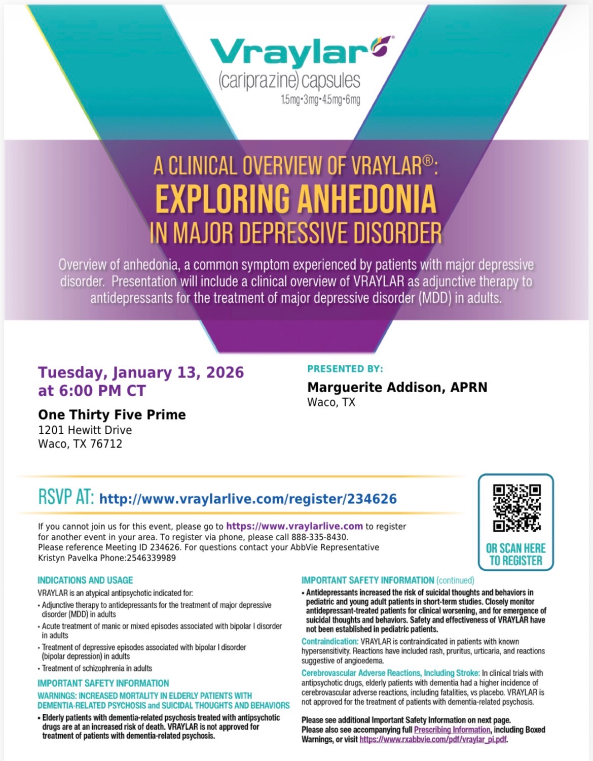 We were be meeting for dinner and a presentation on Exploring Anhedonia in Major Depressive Disorder.